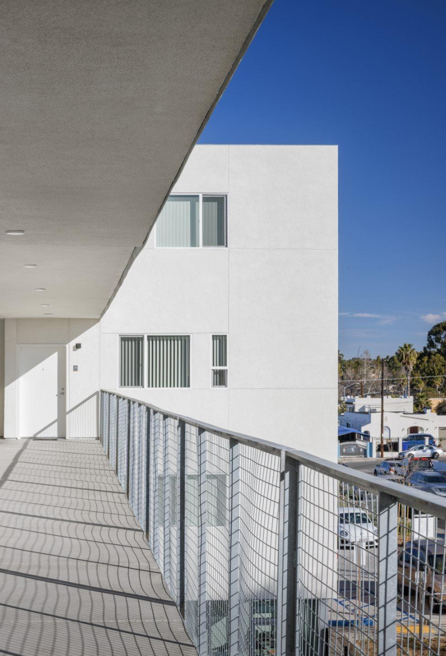 The multifamily housing development includes two 4-story buildings connected by exterior bridges, sculpted to provide a shared courtyard between the two building masses. To minimize solar heat gain, the building massing has been sculpted to minimize southern exposure, and reduce direct sunlight to all glazing. Each building consist of two bars feeding off of an exterior circulation corridor, allowing western ocean breezes to passively cool the units. Interior lightwells allow for daylight to penetrate to the lowest levels, while allowing hot air to be pulled up through the exterior circulation bar.